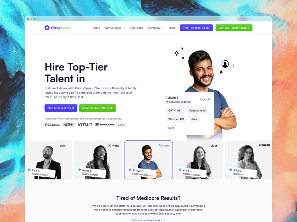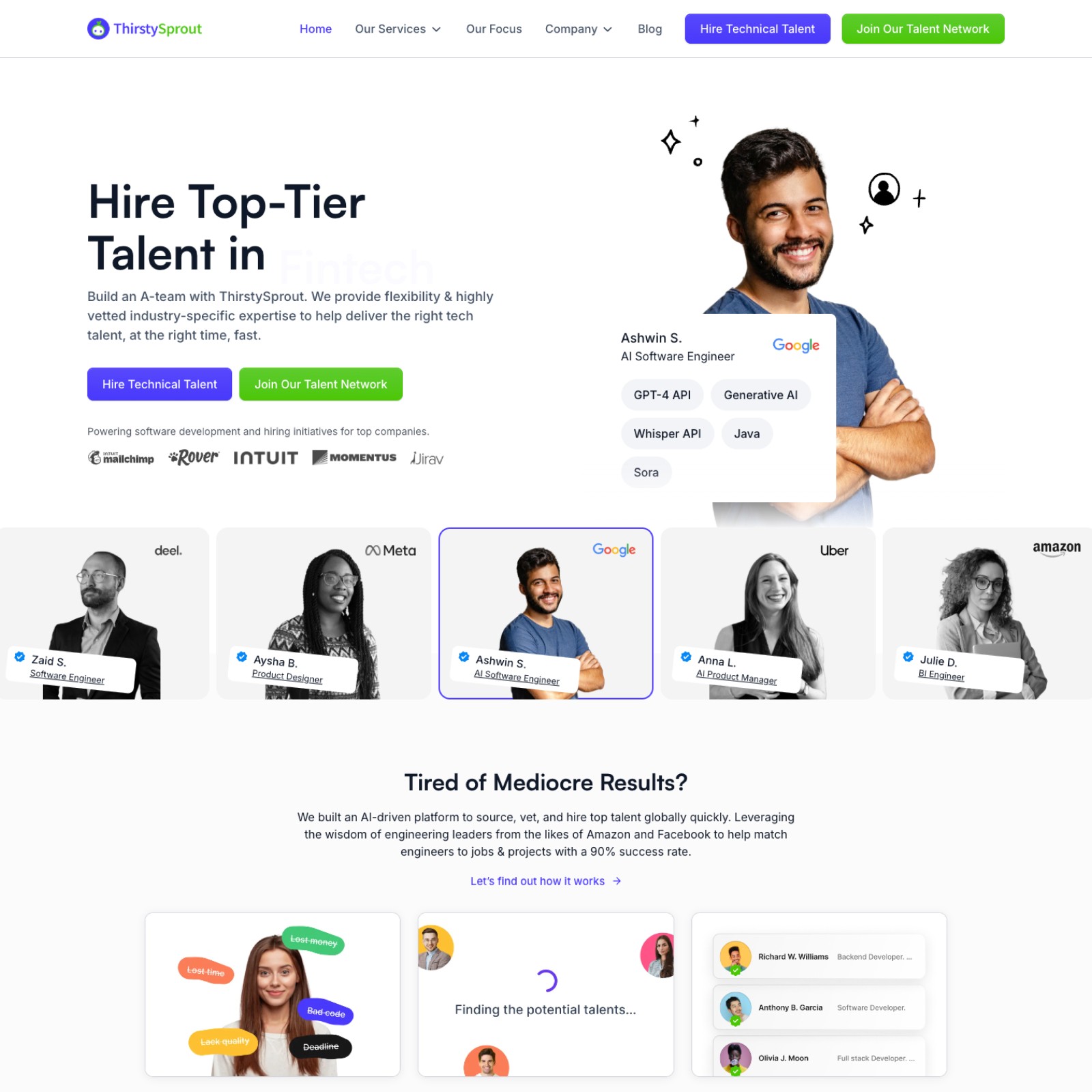 Helped ThirstySprout design a landing page that highlights their flexible, industry-specific approach to delivering top-tier tech talent - fast and at the right time.